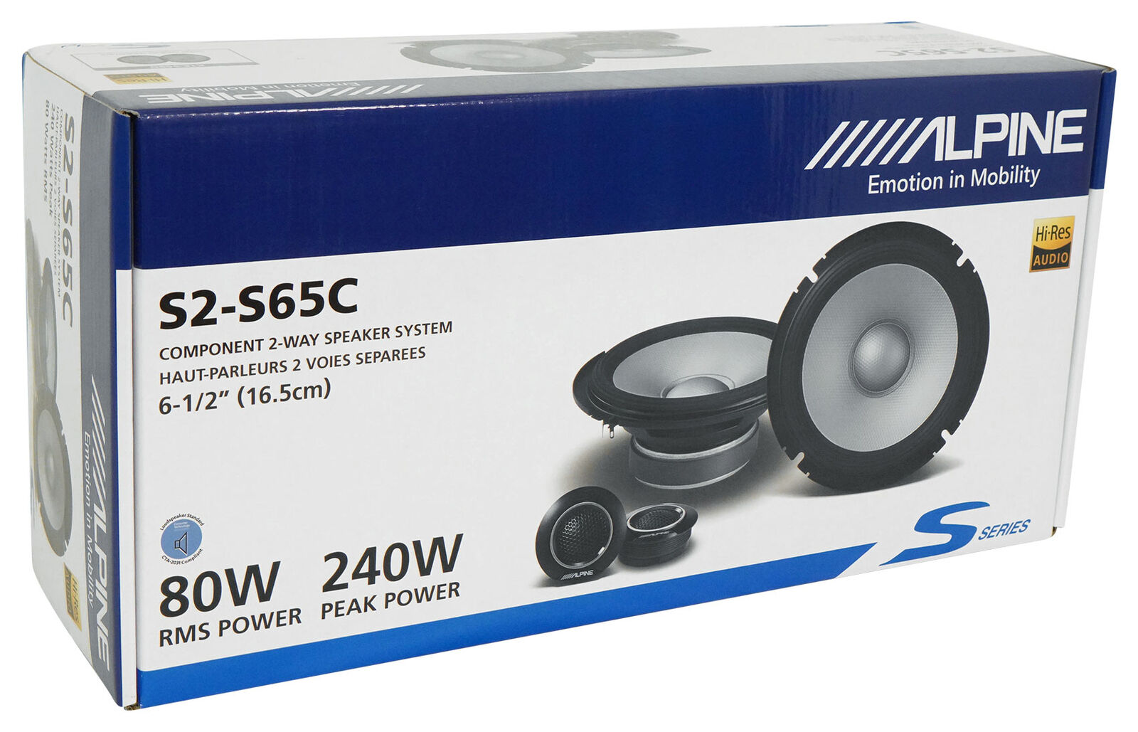 Newly redesigned and Hi-Res Audio Certified, the Next-Generation S-Series S2-S65C 6.5” Component Speakers offer a new standard in entry-level sound performance. Using “trickle-down” technology, inspired design, and performance cues from the Ultra-High-Resolution AlpineF#1Status system, the Next-Generation Alpine S-Series Speakers are now Hi-Res Audio Certified and able to reproduce up to 40kHz frequency response. This new benchmark in sound quality elevates the Next-Gen S-Series Speakers resulting in a more accurate and natural sound at an entry-level price point. Crafted with a unique combination of Poly Propylene, Glass Fiber, and Mica Cone materials, the S2-S65 is designed for lightweight construction, high output, and low distortion, giving you a clean and accurate audio experience.