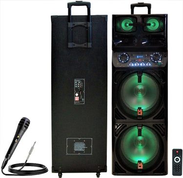 All Portable Speakers featuring a black speaker tower with green lights, microphone, and remote control.