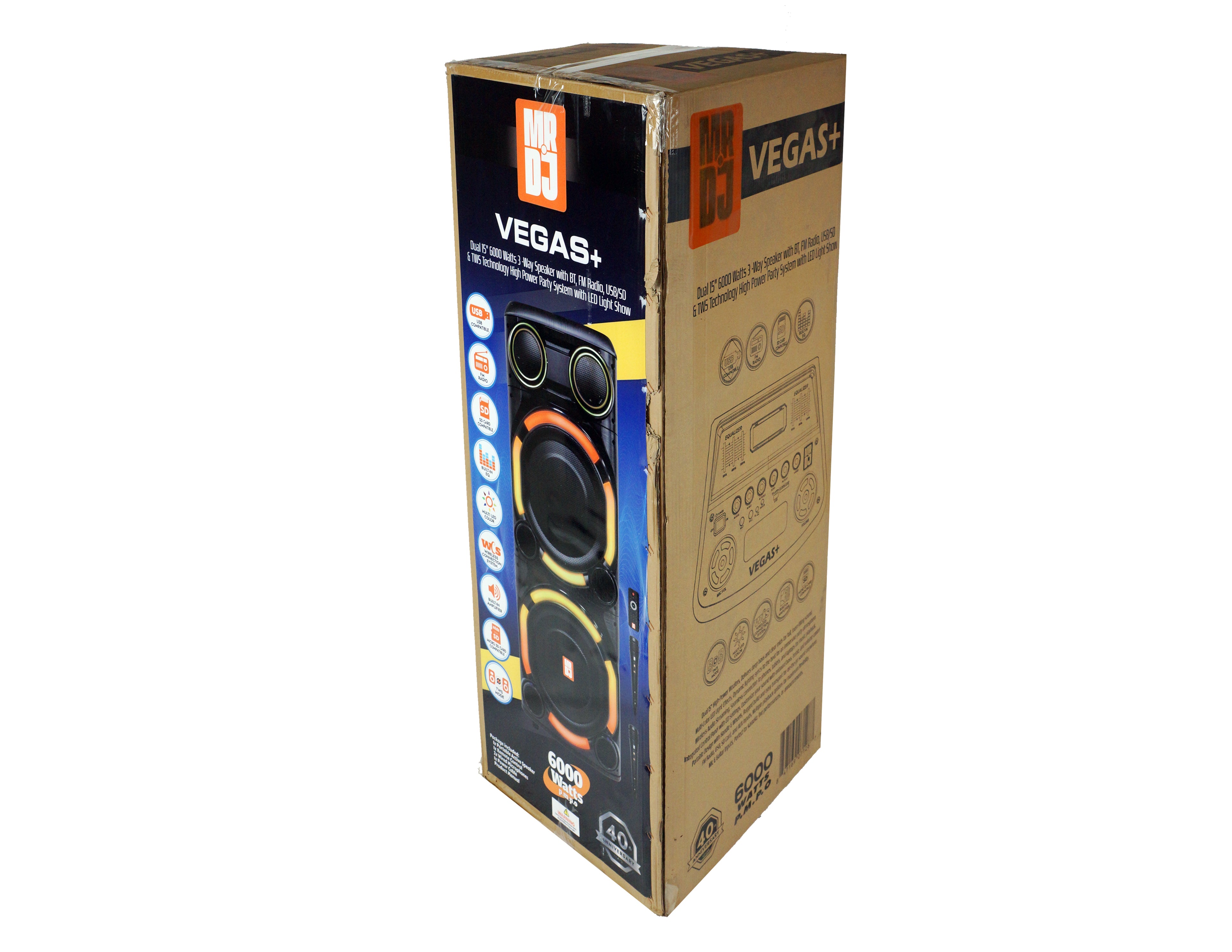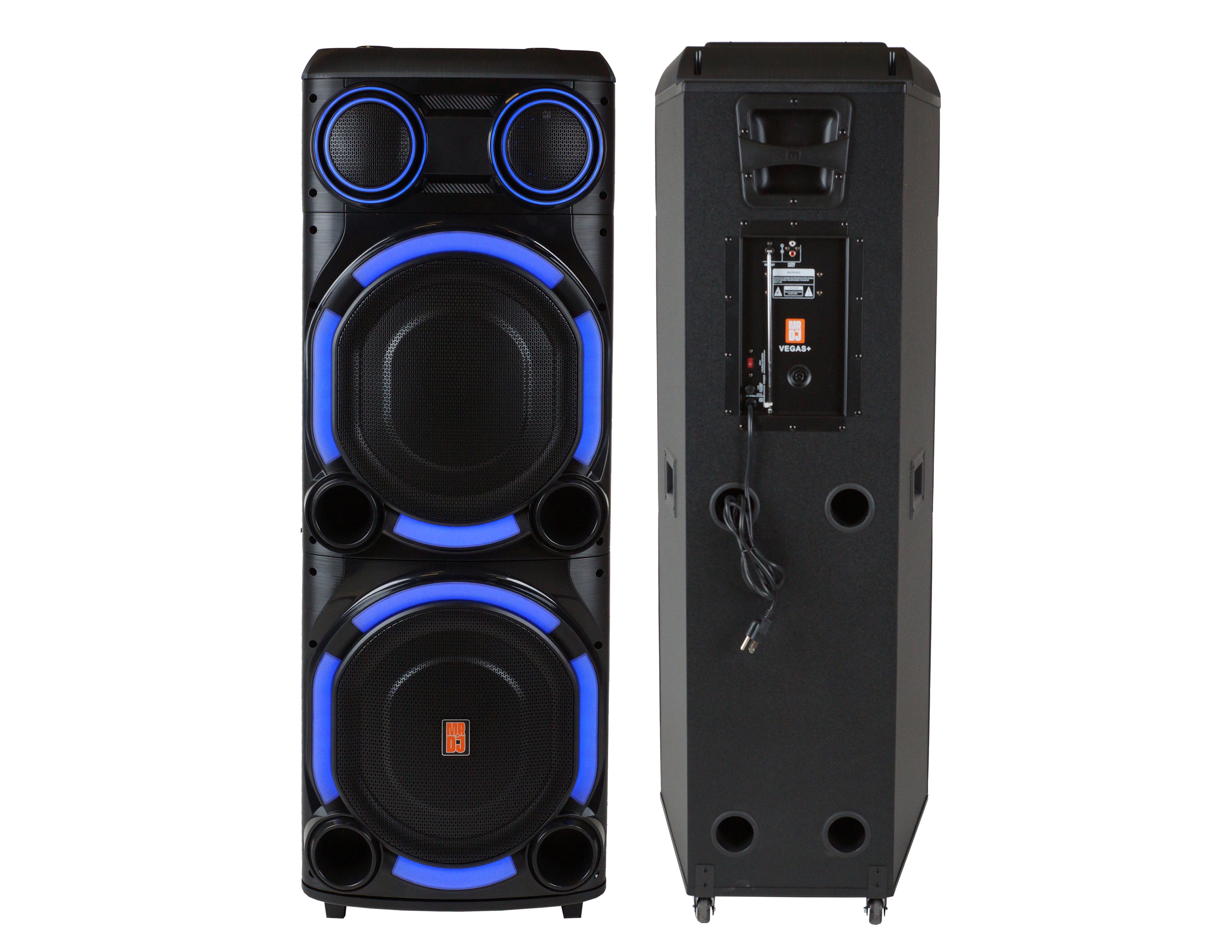 Bring powerful sound and vibrant lighting to every event with the MR DJ Vegas+ Dual 15" Bluetooth Party Speaker System. Designed for parties, karaoke nights, and DJ-style entertainment, this high-performance speaker system delivers deep bass, clear highs, and dynamic LED lighting that instantly transforms any space into a lively party atmosphere. Whether you're hosting a celebration at home, performing at an event, or enjoying music with friends outdoors, the Vegas+ speaker is built to keep the energy going.
