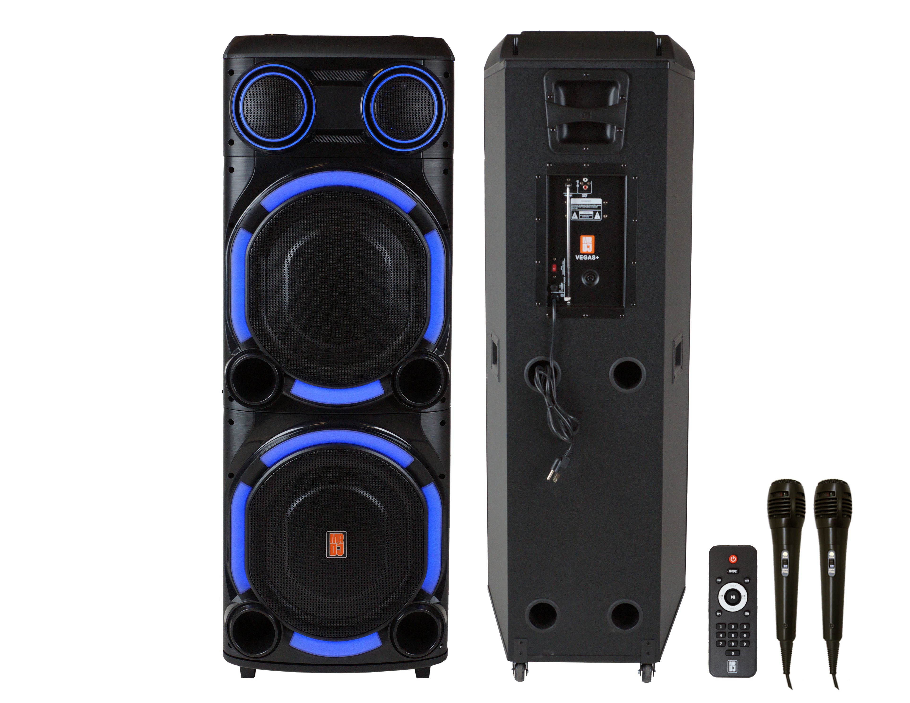 MR DJ Vegas+ Dual 15" Bluetooth Party Speaker System with LED Lights, 2 Microphones & Remote, High Power DJ Karaoke Speaker with USB/TF/AUX, Built-In Equalizer, Bass Boost, Portable PA Speaker for Parties & Events