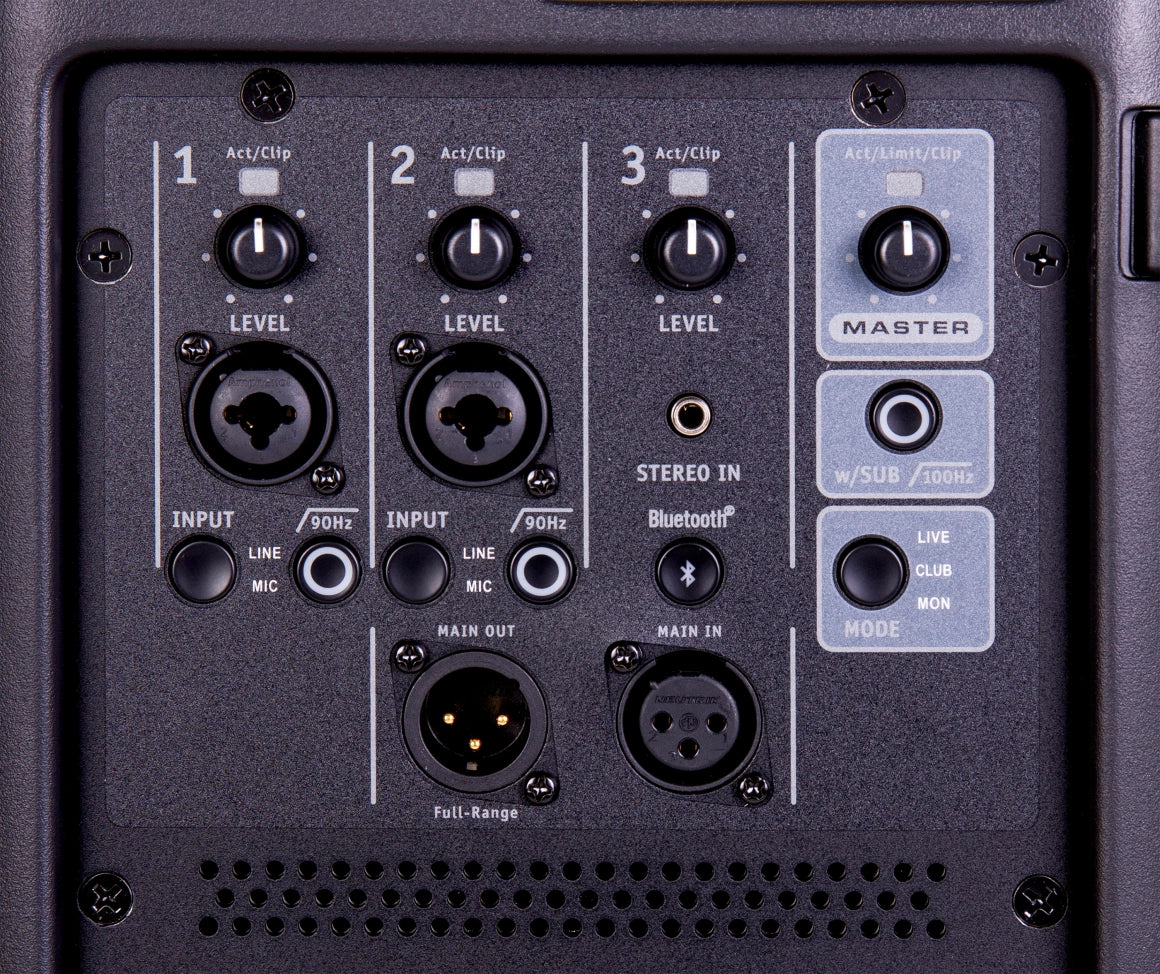 The master section features a high-pass filter for use with a subwoofer or as a vocal monitor, and three selectable modes optimize EQ and dynamics for music playback, live performance, or stage monitor use.