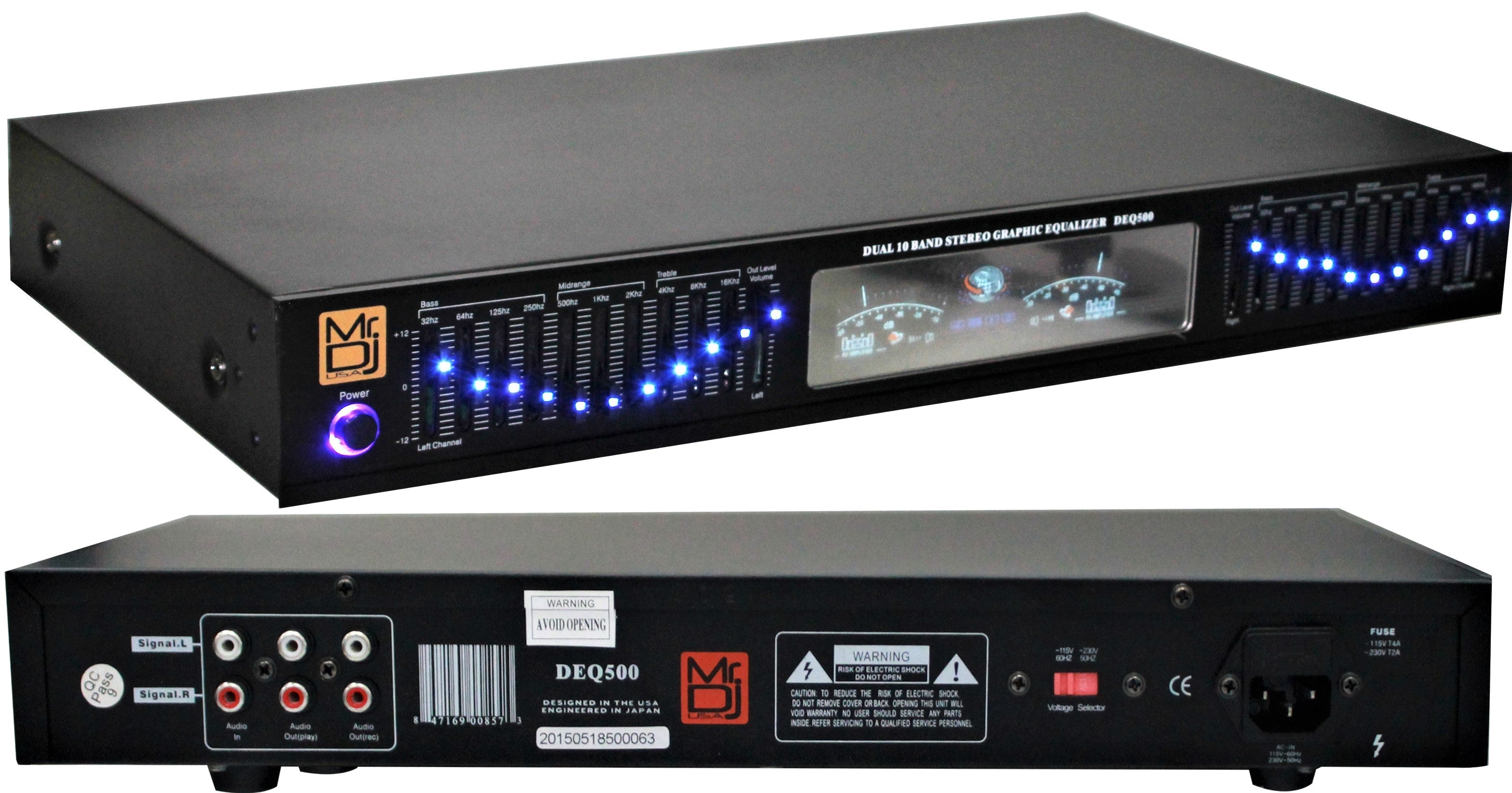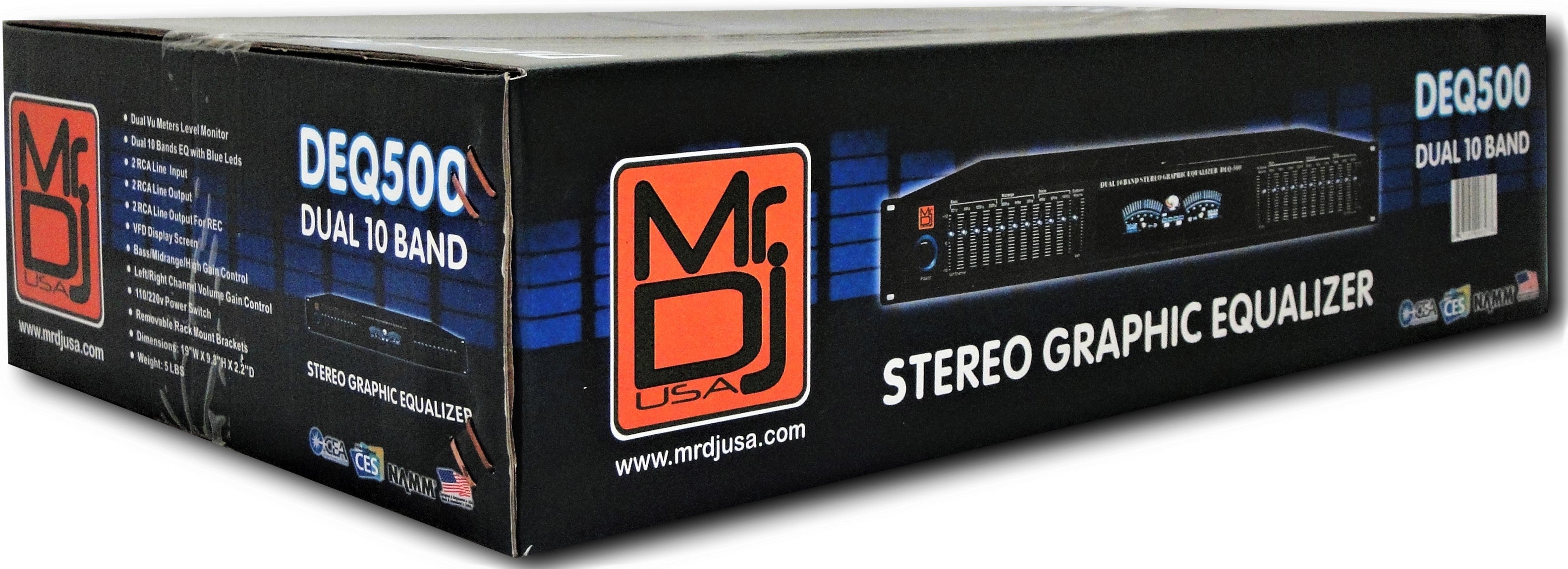 THE MR DJ DEQ500 19" Rack Mount features ten independently adjustable frequency bands, and the MR DJ EQ500 gives you super-precise sonic control with your home stereo system. Far more sophisticated and powerful than your receiver's bass and treble controls, this graphic equalizer lets you fine-tune audio signals to suit your musical taste and also features a dual Vu meter level monitor analyzer display. It doesn't just look cool — seeing the music's frequency content can also help you make suitable sound adjustments.