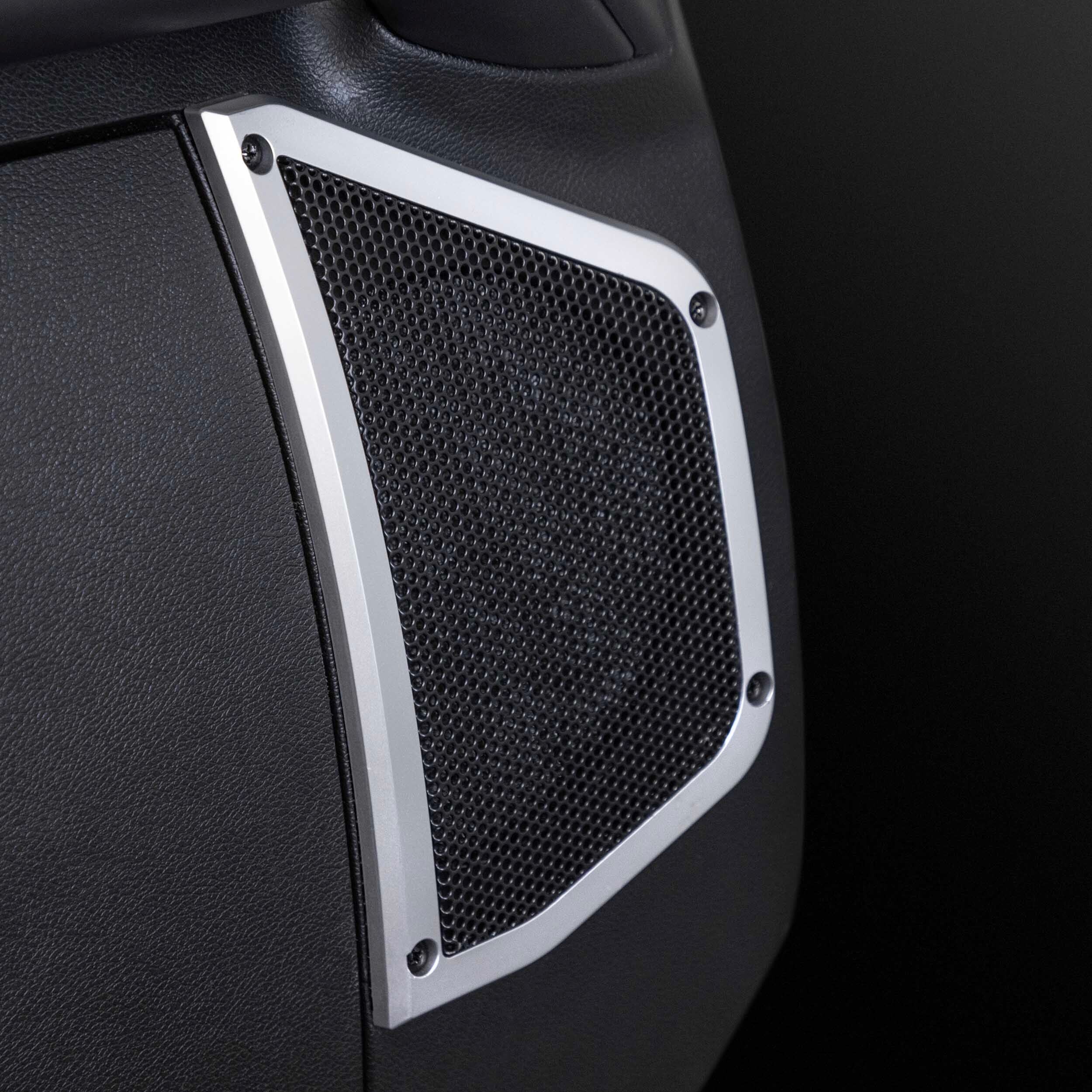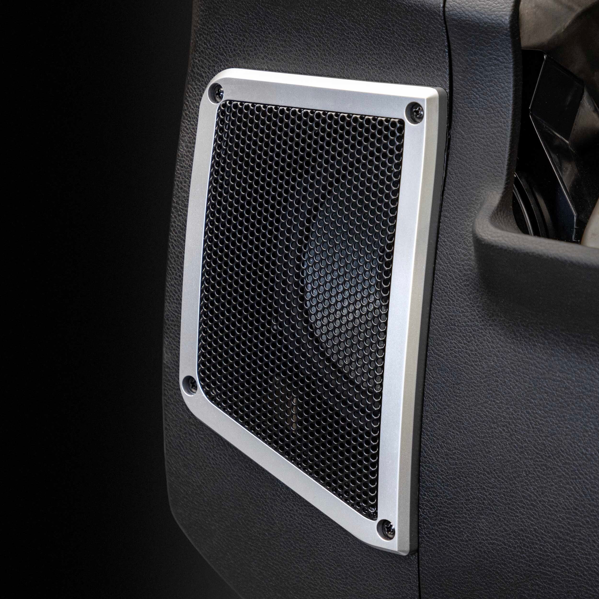 Enhance the appearance of Jeep® interiors when installing aftermarket speakers with this pair of lower dash speaker grille cut-ins. They allow installers to widen the factory 4-inch opening to accommodate an upgrade to 6.5-inch speakers for more vivid sound while adding a bold style. These speaker covers feature a gloss black metal mesh grille with silver accents for a rugged and tough off-road look. They are designed to fit select Jeep Wrangler JL and Gladiator JT vehicles and perfectly complement the JP-1017 dashboard speaker covers and the JP-1014 dash speaker pods.