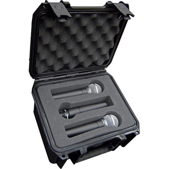 The 3i-0907-MC6 holds six mics in a very compact case and is part of the 3i Waterproof Series of cases. It allows 6 mics to be stored horizontally on two separate layers of foam (3 on top and 3 on bottom). Each microphone cutout measures 1.5" wide by 6.75" long with two perforated removable foam pieces, one located on each end allowing microphone sizes up to 8.5" in length. By removing the perforated foam piece near the grill of the microphone you can change the shape from being round to square. This will accommodate other popular hand held microphones with square style grills such as the Sennheiser and Electro Voice mics. The 3i-0907-MC6 case measures 9" x 7" x 6" deep and is the most compact 6-mic case on the market. The case has convoluted foam in the lid for a compression fit and is covered by SKB's Lifetime Warranty.
