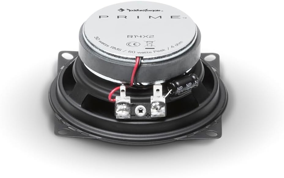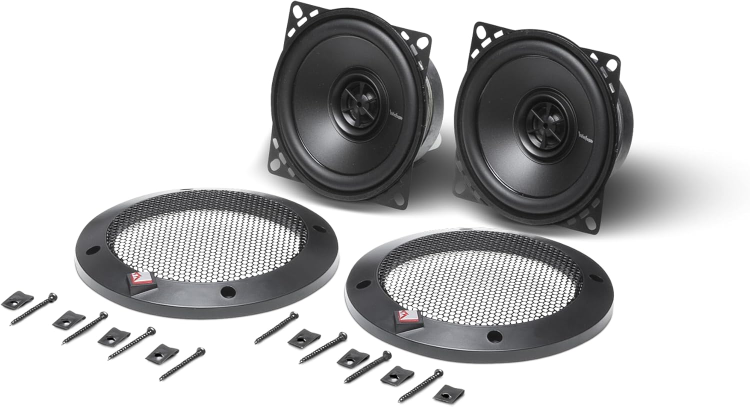The R14X2 is a 4” 2-way full-range speaker rated at 30 watts RMS for a new generation of factory replacement speakers. Kit includes two speakers with grilles, integrated high-pass crossovers, and mounting hardware. The 4" Prime full-range speakers offer Rockford Fosgate sound quality at a fantastic value. Perfect for replacing factory speakers, they feature polypropylene cones and a silk dome tweeter. Includes grilles so they look as good as they sound.