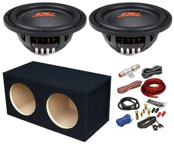 2 DC Sound DSW2000 Fiber Glass 10" Shallow-Mount Subwoofer 2000 Watts Dual 2.5" Voice Coil 4-Ohm + DSS10 Double 10" MDF Enclosure Empty Box + KIT4 4-Gauge Amplifier Amp Kit