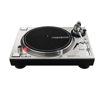 The silver RP-7000 MK2 Upper Torque Turntable System from Reloop features a direct-drive motor and rugged construction. It is resistant to vibrations that heavy bass sounds in DJ booths can cause, and its shock-absorbing feet help to improve isolation further. The surface is coated with a scratch-resistant high-quality silver