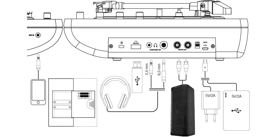 - AUX input facilitates the connection of several turntables (daisy chain)