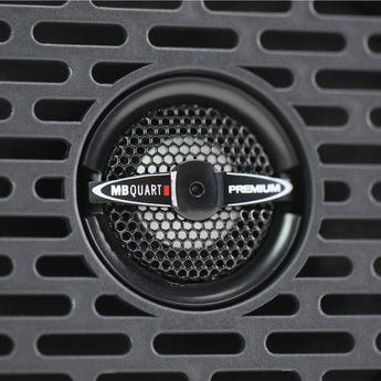 MB Quart MBQBRO-STG6-OEM-1 800 watt eight speaker STAGE 6 audio system with 6.5 inch 3-way front component speaker system, two 6.5 inch 2-way coaxial speaker pods, and powered by two 400 watt 2-channel Class-D amplifiers. Requires the OEM base model system or aftermarket source unit. (Raptor Trims require the additional purchase of MBQBRO-RAPB rear speaker brackets)