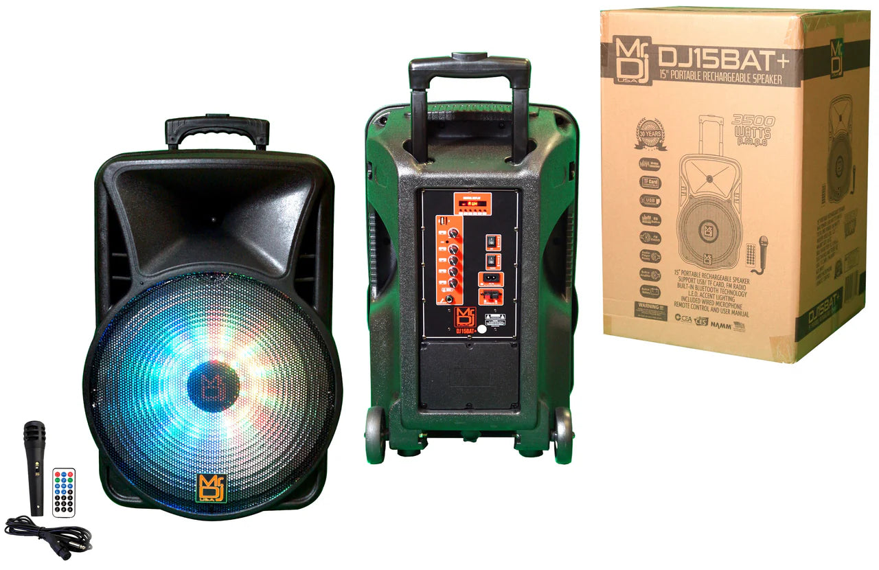 15" Portable Active Speaker With Rechargeable Battery 3500 Watts P.M.P.O., Built-In TWS (True Wireless Stereo). TWS, or True Wireless Stereo, refers to a technology that enables the wireless pairing of two audio devices via Bluetooth. Bluetooth Technology Can Stream Music From Bluetooth-Enabled Devices, And Through USB, Or Can Be Connected With A Cable Through The Aux-In Port., USB Card Reader, FM radio, RGB Party LED lights, and Microphone 1/4” Jack, Aux-In Allows You To Connect An External Audio Device, Mode Accent Lighting, Led Screen Display, and Grill-Covered Speakers And Equipped With A Handle For Easy Transportation. The Speaker Also Has A Microphone Input for Karaoke. The Rechargeable Battery Lasts for Hours, so that You Can Stream Music Even In Places Without An Outlet Nearby.