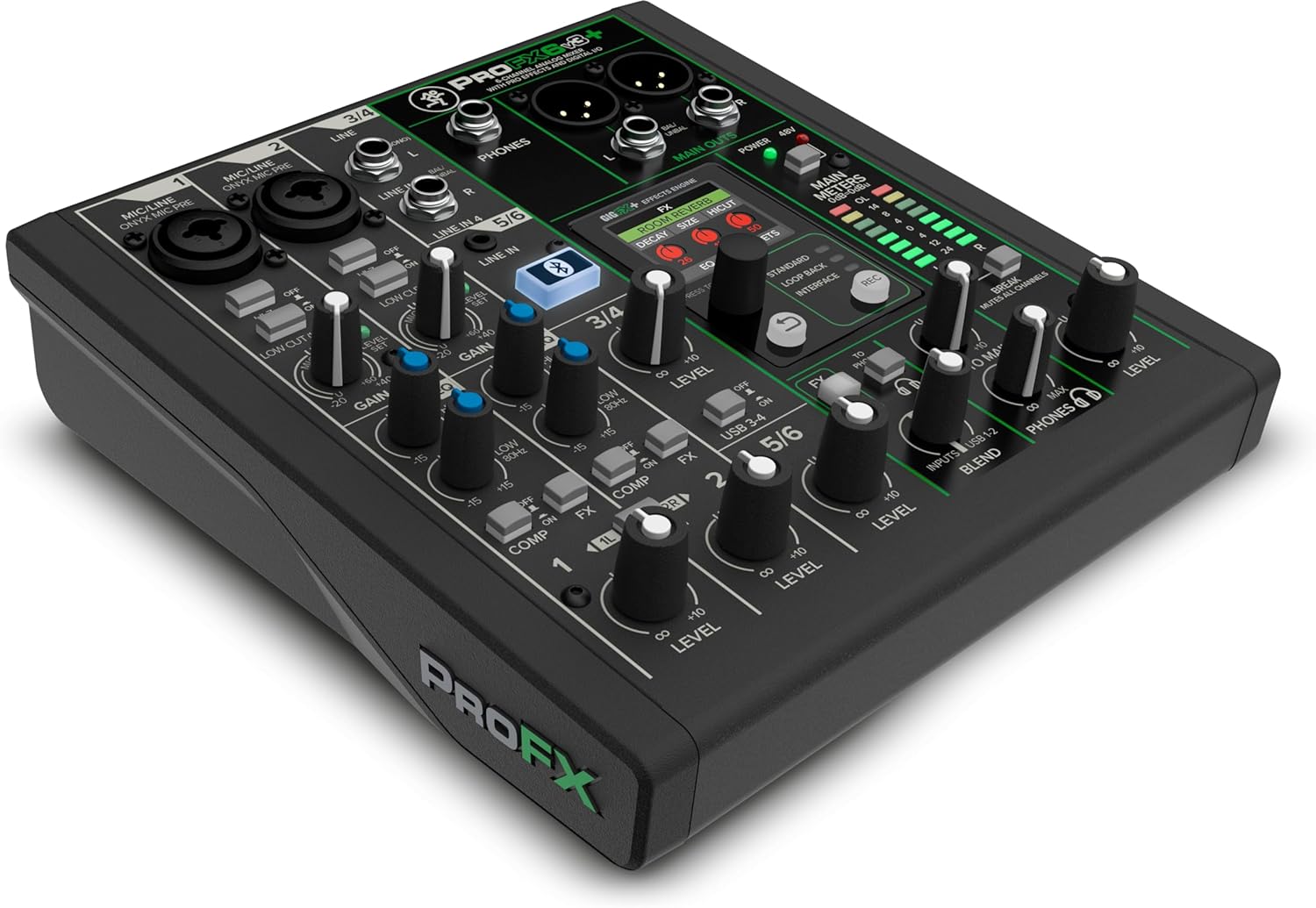 Mackie ProFX6v3+ is a professional 6-channel analog mixer and USB-C audio interface featuring Onyx preamps and EQ, switchable USB recording modes, Bluetooth® for capturing phone calls, and upgraded effects you can adjust on a color LCD screen.